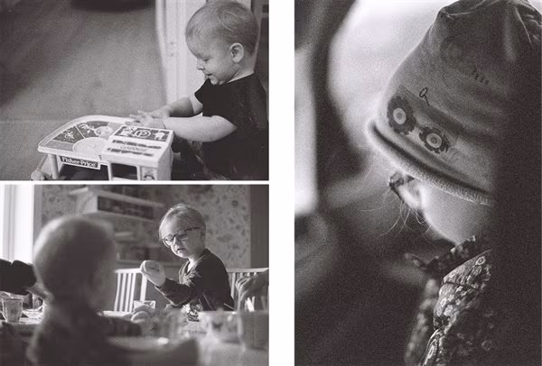 Det dröjde inte länge innan jag blev vän med kameran, som var väldigt intuitiv att använda. Redan på lunchen tog jag några testexponeringar och sedan tog kameran med mig på en helg hos mina svärföräldrar. Jag visste att det skulle bli en utmaning att få tillräckligt snabba slutartider för att kompensera för det svagare inomhusljuset och mina snabba barn som motiv. Men med den ljusstarka optiken och den känsliga filmen lyckades jag fånga några riktigt bra bilder.