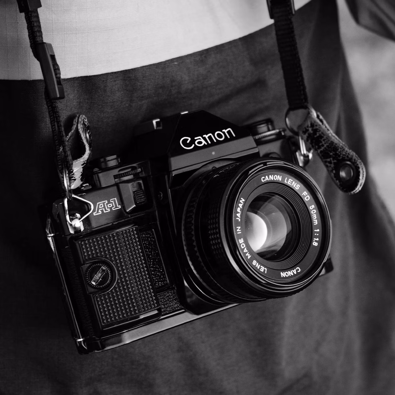När jag började leta efter kamerautrustning kollar jag igenom våra skåp med begagnade kameror och objektiv och hittade en Canon A-1 med ett FD 50mm f/1,8 objektiv – en perfekt kombination. Objektivet är ljusstarkt och kameran har både manuella inställningar och automatisk ljusmätning, vilket gör att jag enkelt kan justera inställningarna vid behov.